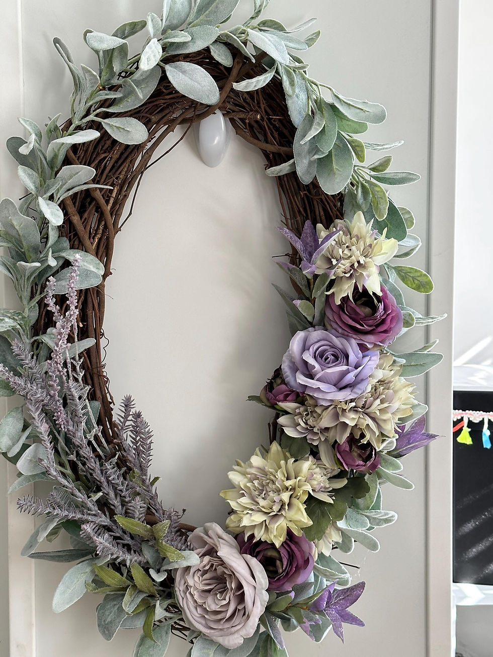 A wreath to adorn your door any time of the year. A beautiful and elegant wreath design! Using a large oval grapevine wreath as the base adds a natural and rustic touch, while the lamb ear vine trim and lavender flowers provide a soft and romantic feel. The combination of textures and colors make for a stunning decoration.